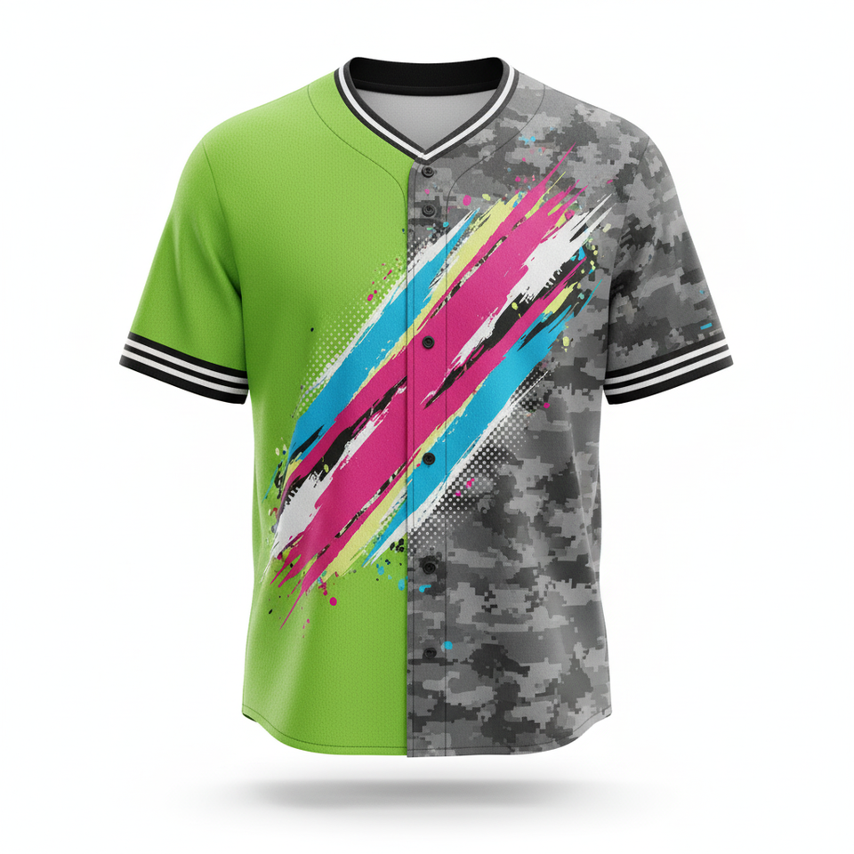 เสื้อเบสบอลผ้าโพลีเอสเตอร์พิมพ์ลายแบบลอกลายด้วยความร้อนแบบ100% มีลวดลาย3D สีนีออนสีชมพูและสีเหลืองกราฟิกแห้งเร็ว
