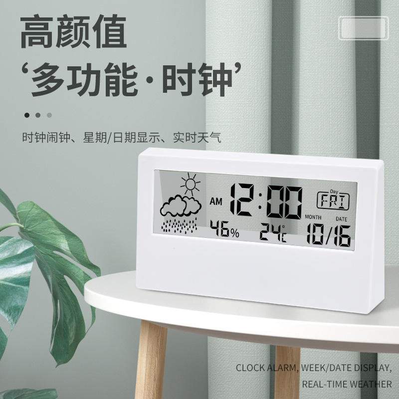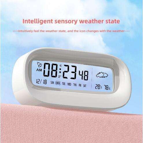 นาฬิกาปลุกอิเล็กทรอนิกส์รูปทรงวงรีจอแสดงผลดิจิตอลอุณหภูมิความชื้นบนโต๊ะใช้งานบนเดสก์ท็อป