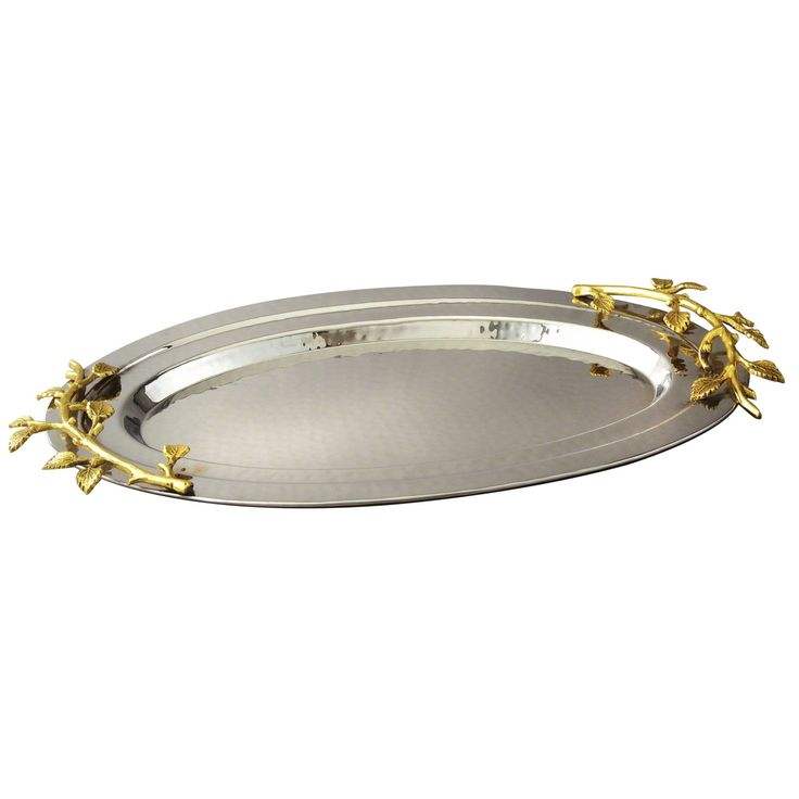 ถาดทรงรีทำจากสเตนเลสลายเถาองุ่นสีทองหรูหราพร้อมด้ามจับสีทองถาดตกแต่งงานฝีมือทำจากโลหะที่แตกต่างกัน