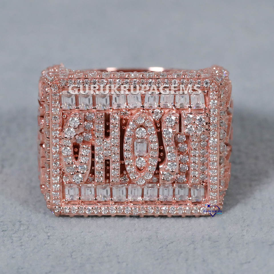 แหวนฮิปฮอปประดับเพชรอย่างหรูหราขนาด14 KT สีโรสโกลด์พร้อมเม็ดกลมและบาแกตต์ตัดเพชรสำหรับผู้ชายใน VVS