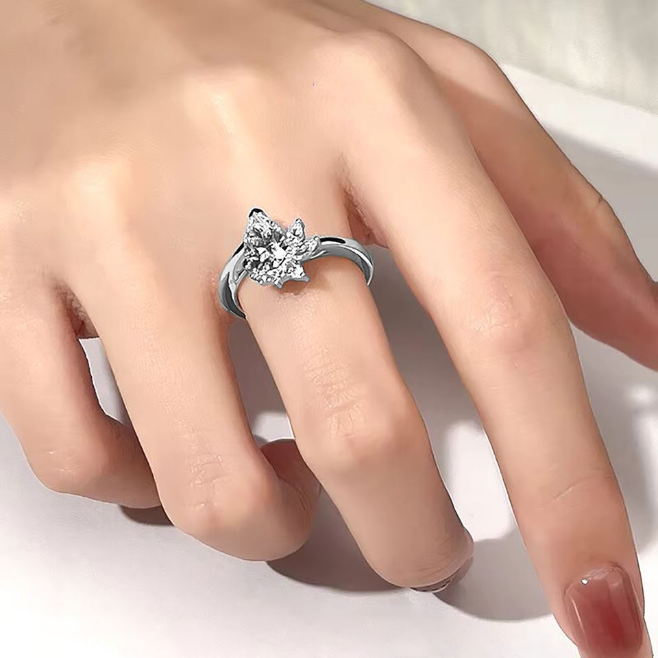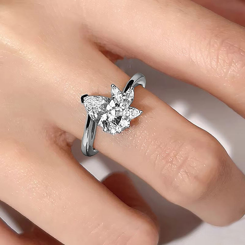 แหวนหมั้นทองคำแท้ 14K ประดับเพชรแล็บทรงลูกแพร์และทรงมาร์ควิส ดีไซน์ลายดอกไม้ แหวนแต่งงาน แหวนซ้อนสำหรับเธอ