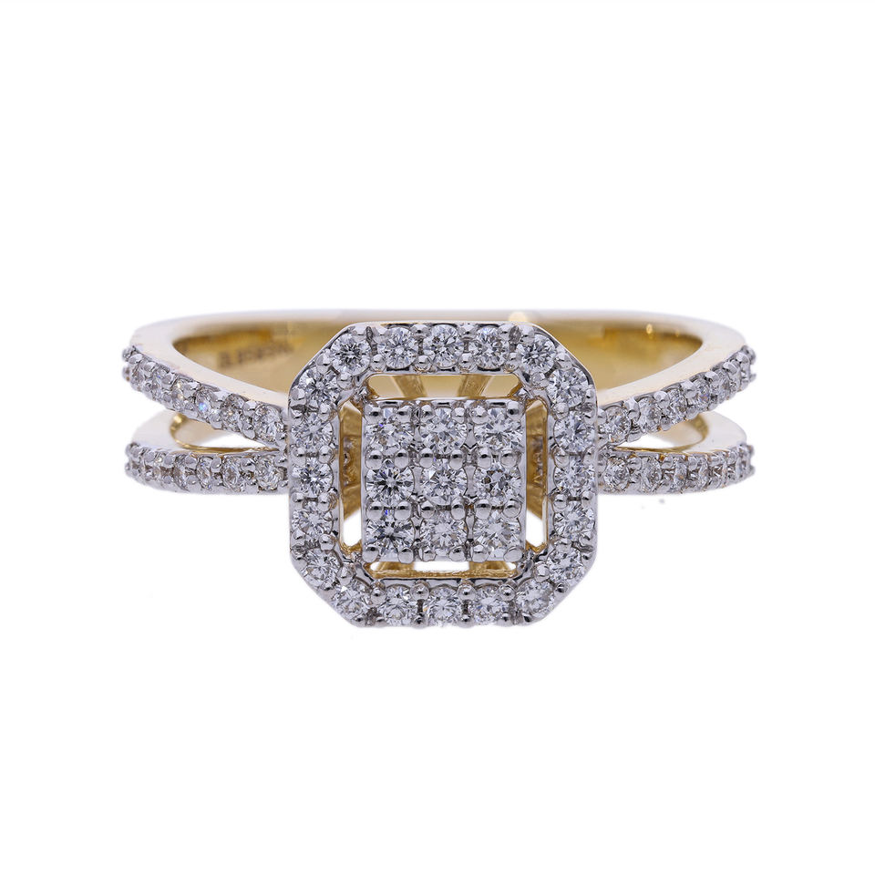 แหวนเพชรสีเหลืองทอง14K สุดหรูพร้อมห่วงเหลี่ยมตรงกลางและปูรัศมีคู่บนก้านแยกแหวนเพชรธรรมชาติ