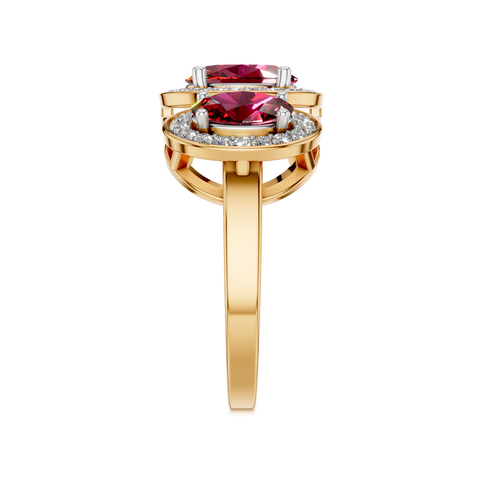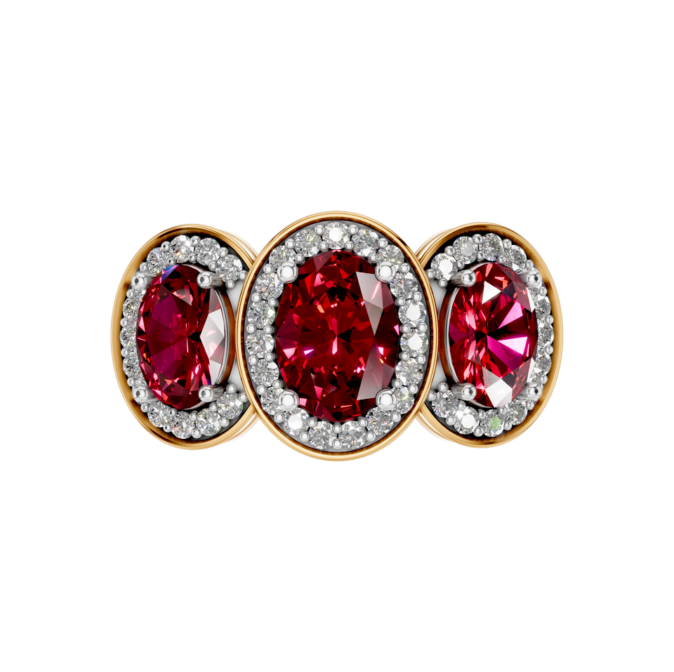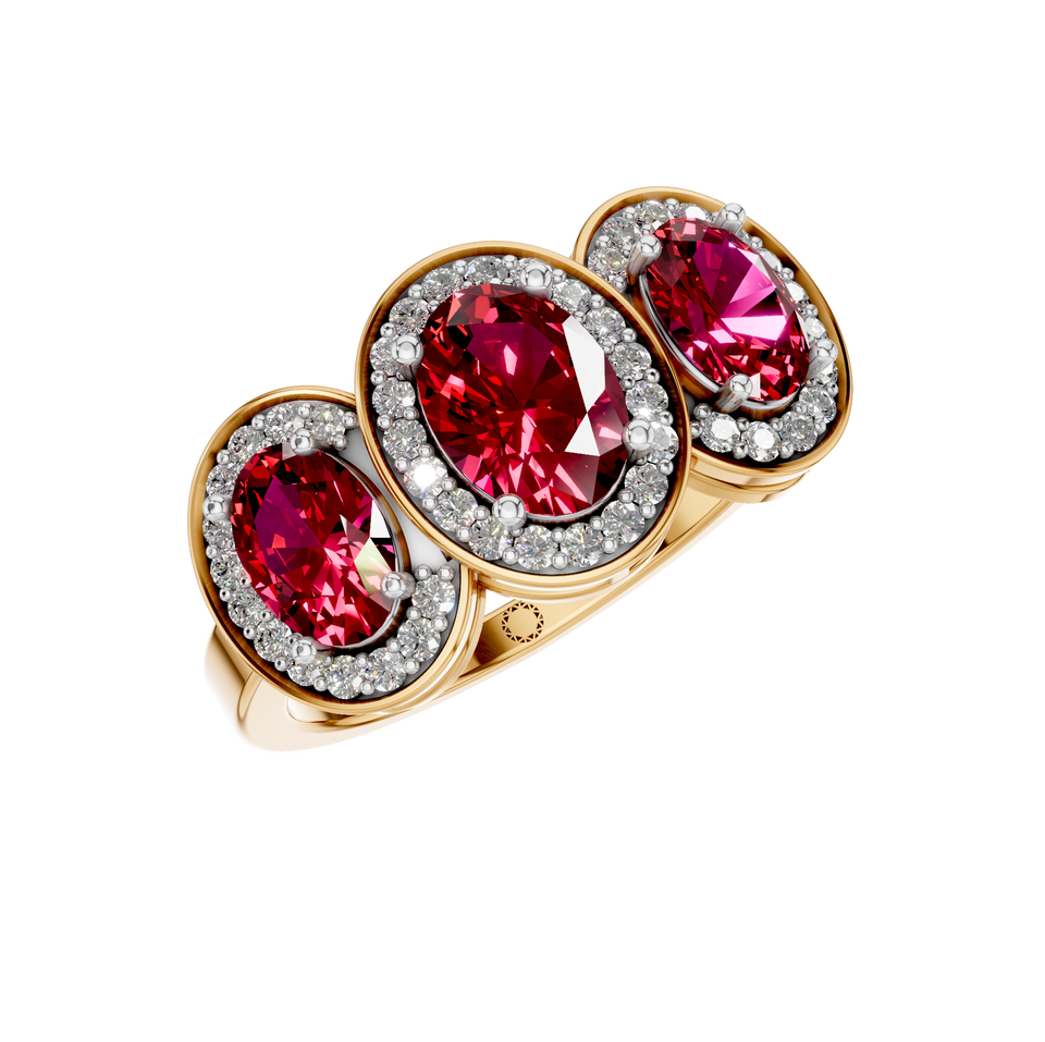 แหวนสามหินทับทิมสีแดงธรรมชาติประดับเพชรแวววาว