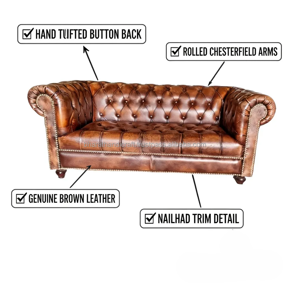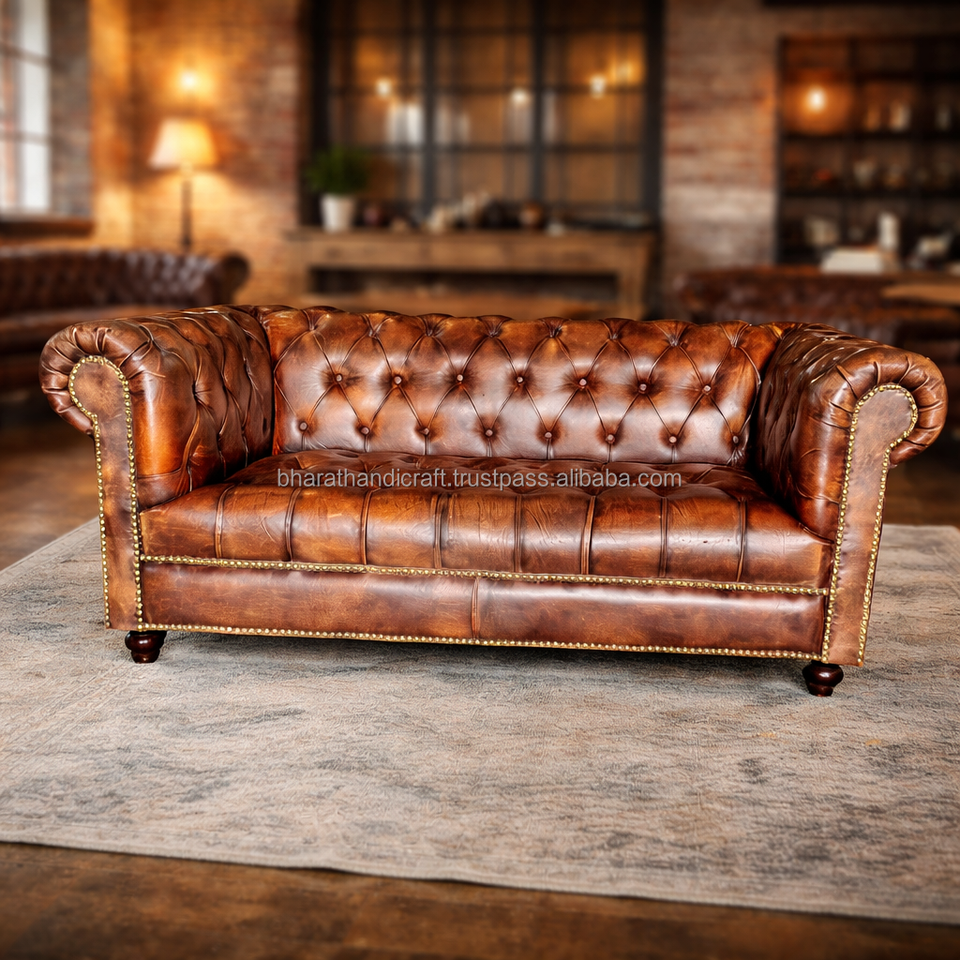 โซฟาเชสเตอร์ฟิลด์ 2 ที่นั่ง ดีไซน์หรูหรา หุ้มหนังวินเทจ ดีไซน์เหนือกาลเวลา เบาะนุ่มสบาย โครงสร้างแข็งแรงทนทาน เหมาะสำหรับใช้ในบ้าน