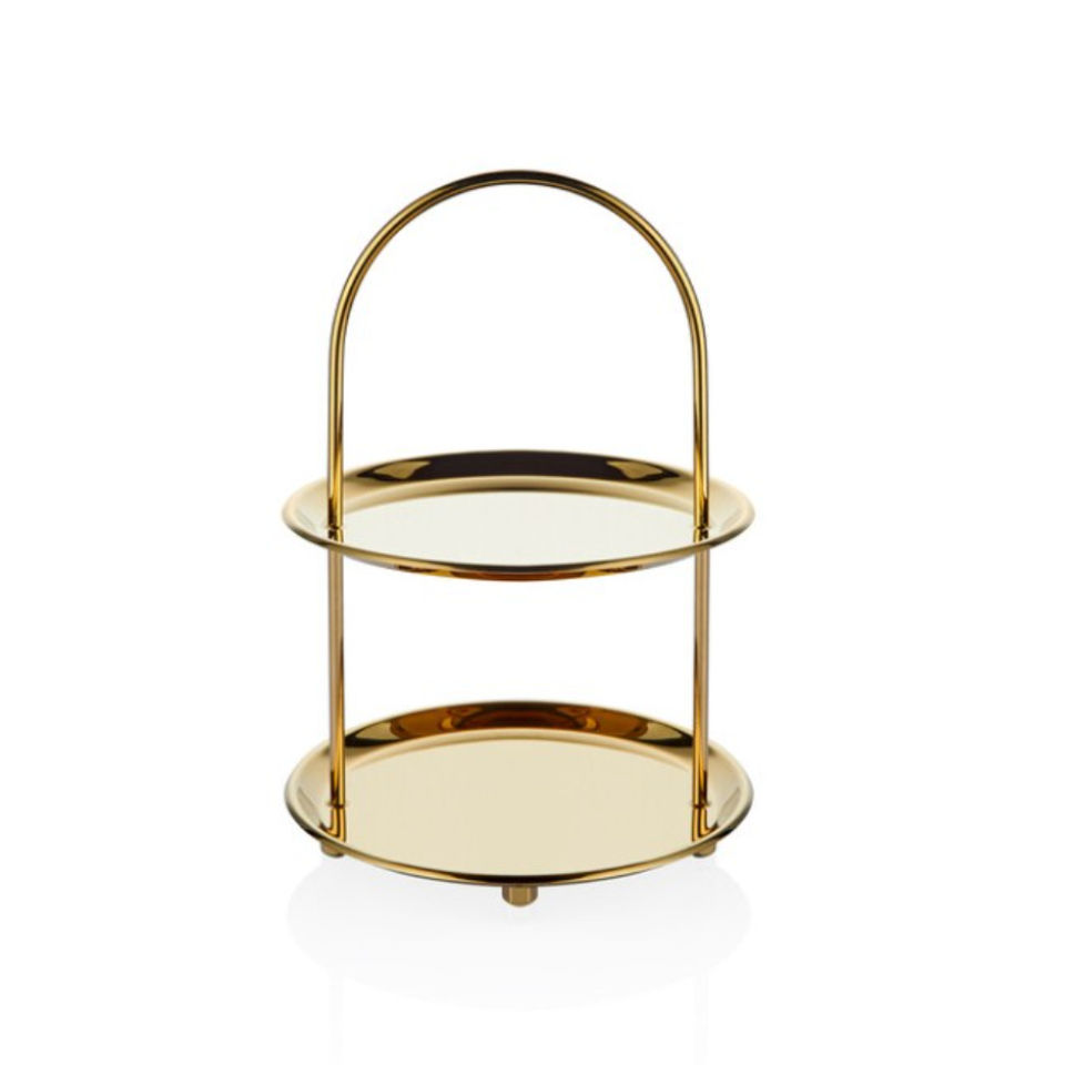 ที่วางเค้กโลหะสีทอง2ชั้นหรูหราพร้อมที่จับถาดโชว์ขนมสแตนเลสทรงกลมสำหรับงานในบ้านและงานแต่งงาน