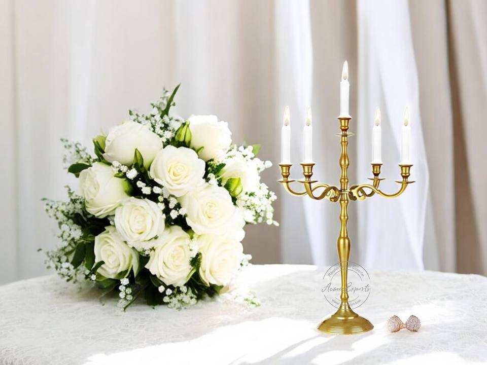 "เชิงเทียน5แขนสีทองหรูหราเหมาะสำหรับงานแต่งงานและโอกาสพิเศษเพิ่มเสน่ห์และความซับซ้อนในการตกแต่ง"