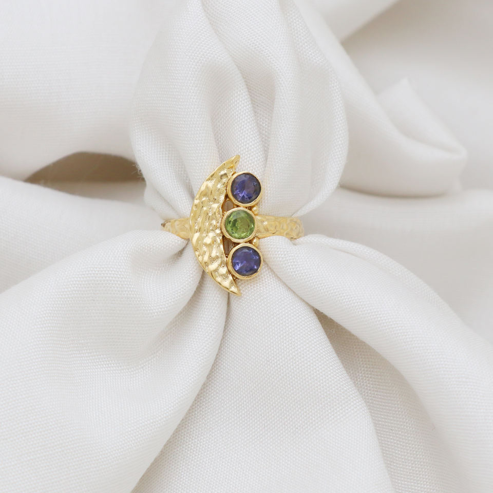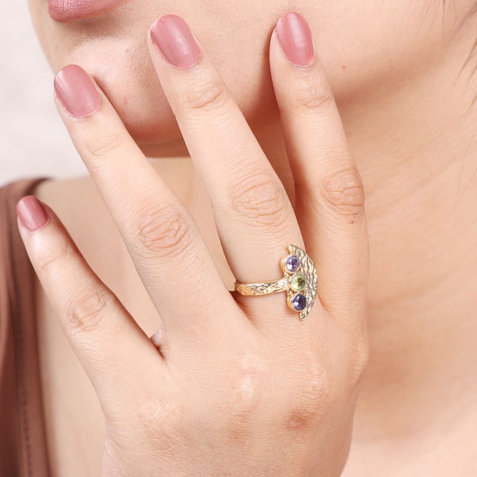 แหวนเงินแท้ 925 ประดับอิโอไลต์และเพอริดอต ชุบทอง 18K ดีไซน์ทันสมัยจากเมืองชัยปุระ เหมาะสำหรับงานแต่งงาน งานเลี้ยง และวันครบรอบ
