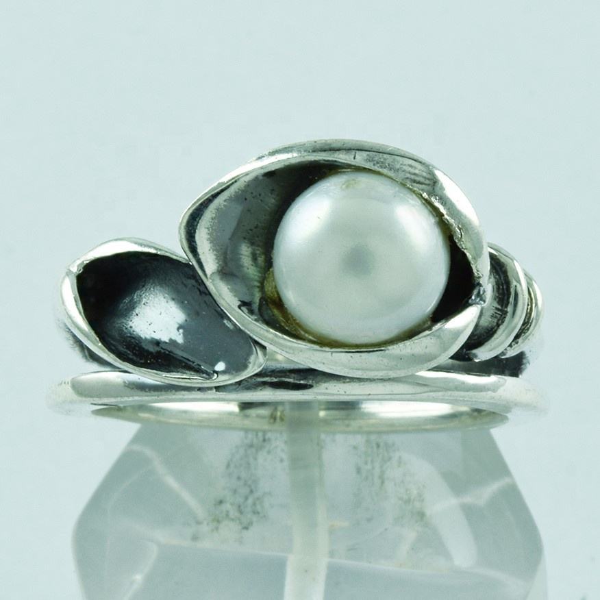แหวนเพชรรูปดอกลิลลี่สีเงิน925สง่างามประดับด้วยไข่มุกพลอยที่สวยงามแหวนเครื่องประดับมุกสุดหรู
