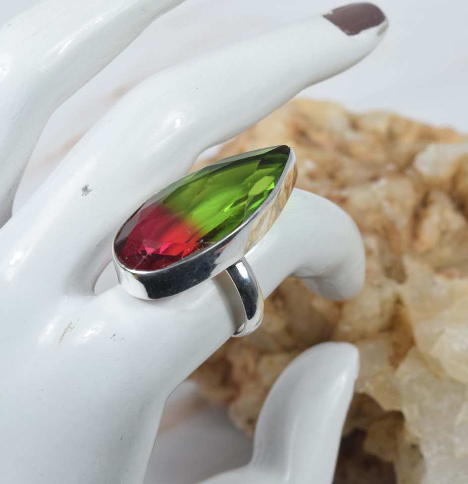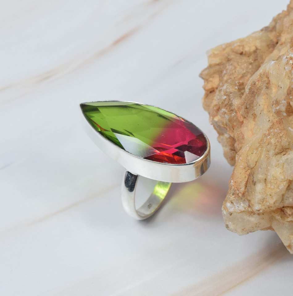 แหวนควอตซ์แตงโมเงินสเตอร์ลิง925หรูหราทำด้วยมือเครื่องประดับอัญมณีรูปลูกแพร์สำหรับงานเลี้ยงของขวัญที่สมบูรณ์แบบสำหรับเธอ