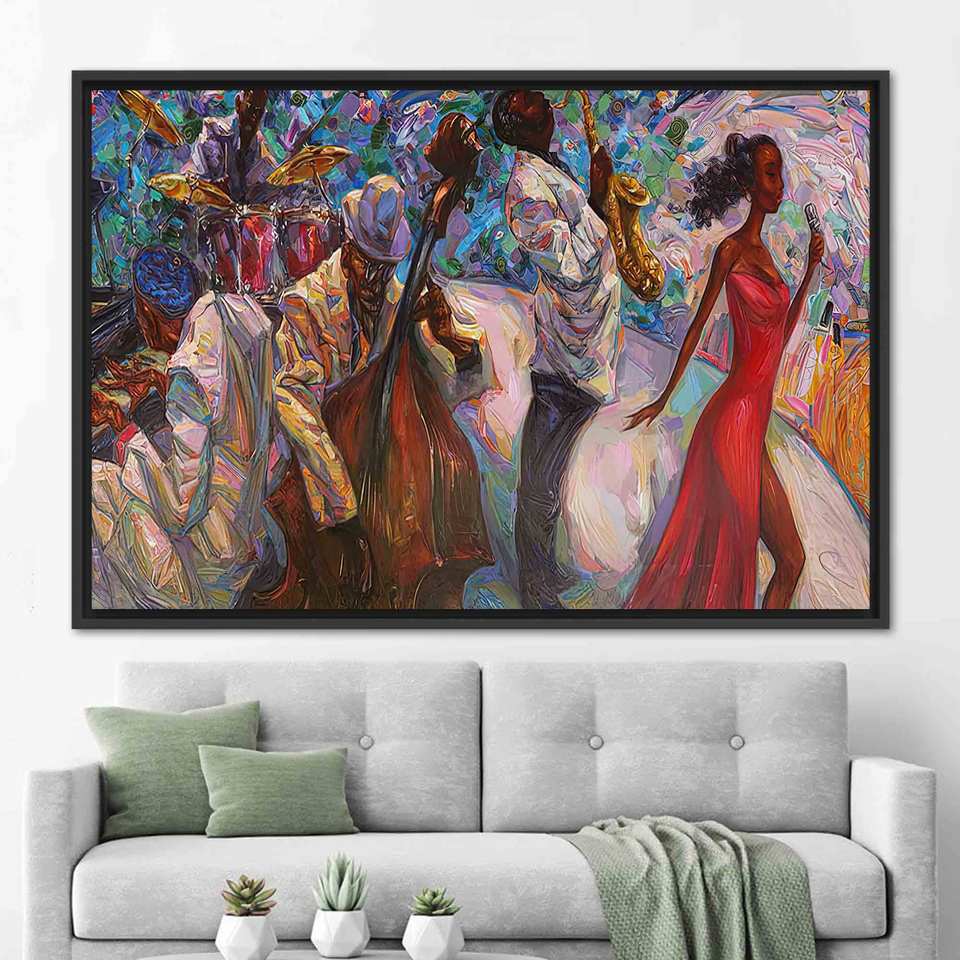 ภาพพิมพ์บนผ้าใบของนักดนตรีแจ๊สชาวแอฟริกันที่สง่างาม - ศิลปะติดผนังสมัยใหม่,1P:กรอบสีดำ