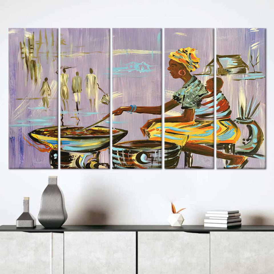 ภาพพิมพ์บนผ้าใบผู้หญิงแอฟริกันสุดสง่างาม: ฉากการปรุงอาหาร ชุดผ้าใบ 5 ชิ้น