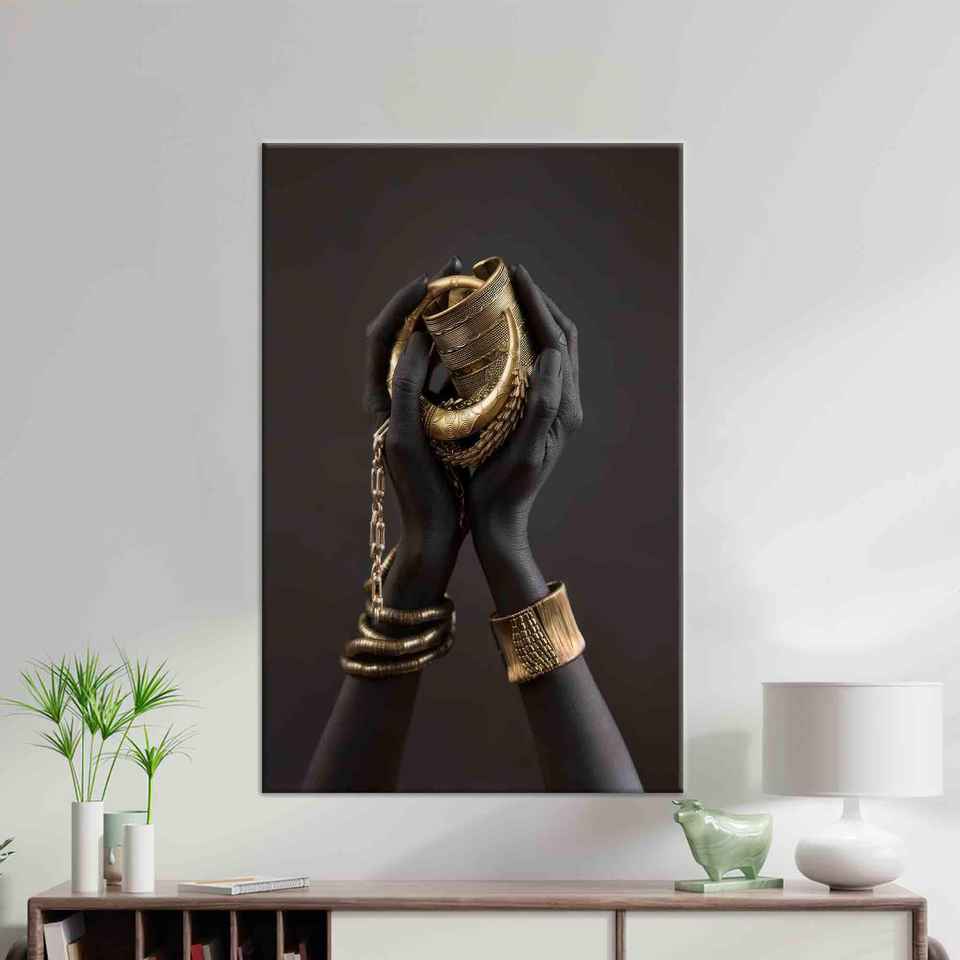 ภาพพิมพ์บนผ้าใบลายผู้หญิงแอฟริกันสุดสง่างามพร้อมเครื่องประดับทอง: ของตกแต่งผนังสุดหรู, ผ้าใบพิมพ์ลาย