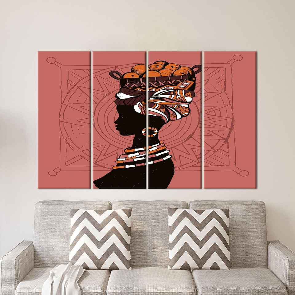 ภาพพิมพ์บนผ้าใบลายผู้หญิงแอฟริกันสุดสง่างามพร้อมตะกร้า 4 ชิ้น: ภาพพิมพ์แบบห่อขอบสำหรับตกแต่งผนัง