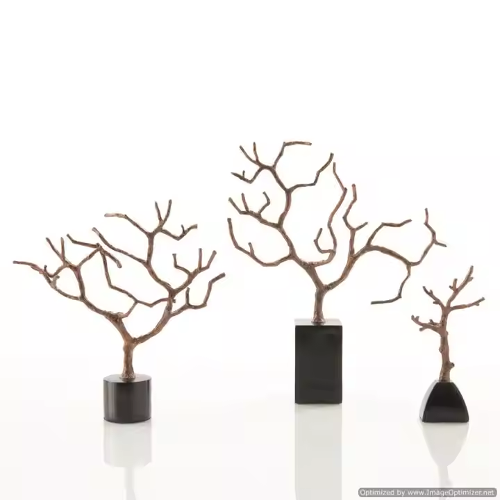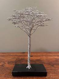 ต้นไม้อะลูมิเนียมโทนสีเงินที่สง่างามของประติมากรรมชีวิตบนฐานไม้มะม่วง