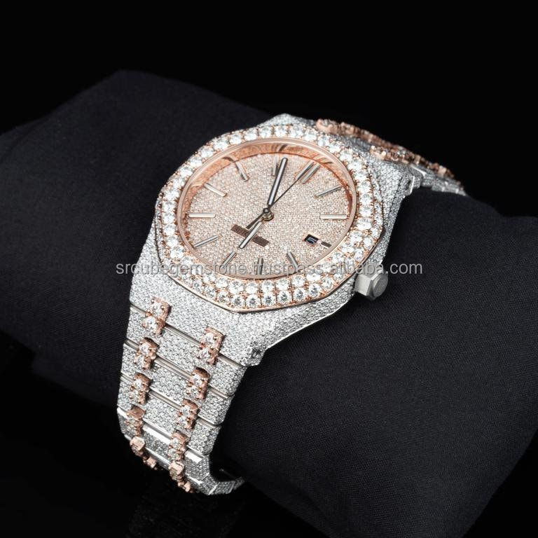 นาฬิกาฮิปฮอปสแตนเลสแบบโบราณหรูหราผลิตจากโลหะสองโทนสีเย็นแบบเต็มวันที่เคลื่อนไหววันที่แนวสปอร์ตแฟชั่นราคาถูก20มม.