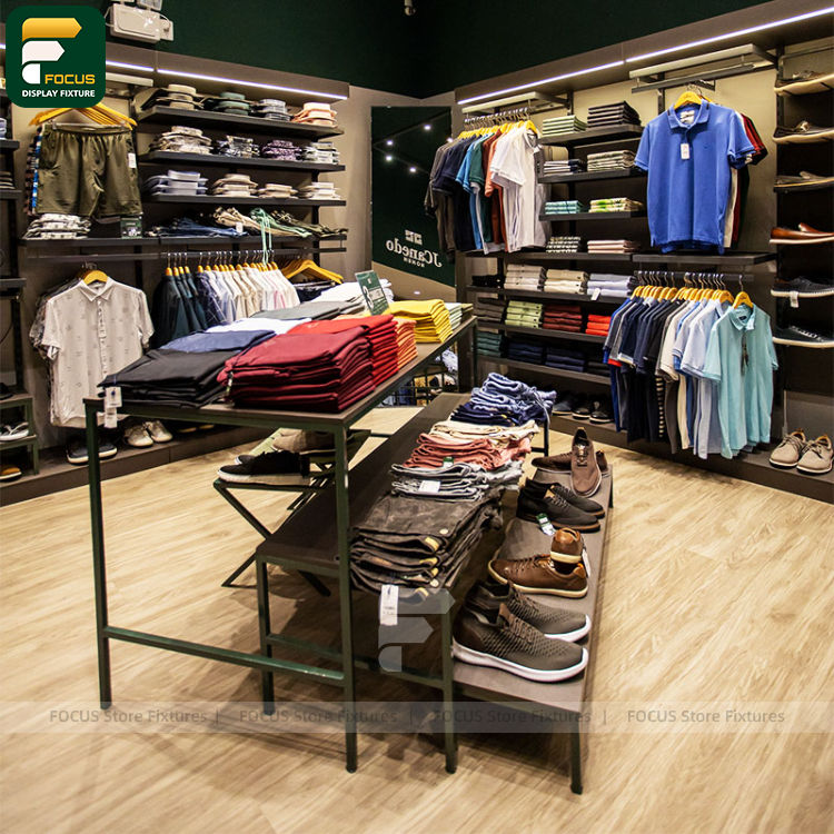 ชั้นวางเสื้อผ้าแบบมีแผงหลังสำหรับร้านเสื้อผ้าหรูหรา ตู้แขวนเสื้อผ้าพร้อมชั้นวางกระจก อุปกรณ์ตกแต่งร้านค้าปลีกแบบแพ็คเกจ
