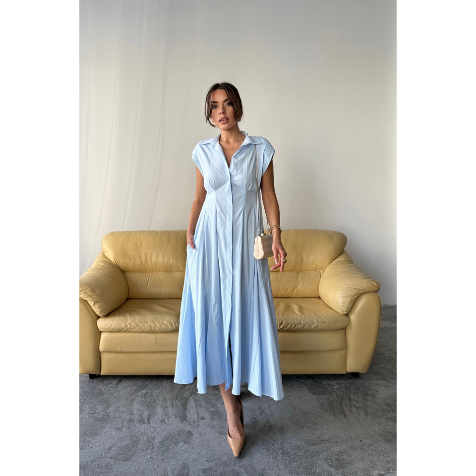 ชุดเดรสผ้าป๊อปลินสีฟ้าอ่อนสวยหรูสำหรับสุภาพสตรีออฟฟิศ ไซส์พลัส แบบไม่มีแขน บุฟองน้ำด้านหน้า ติดกระดุม แต่งระบายช่วงเอว ผ้าบางเบา เหมาะสำหรับใส่ในเวลากลางวัน