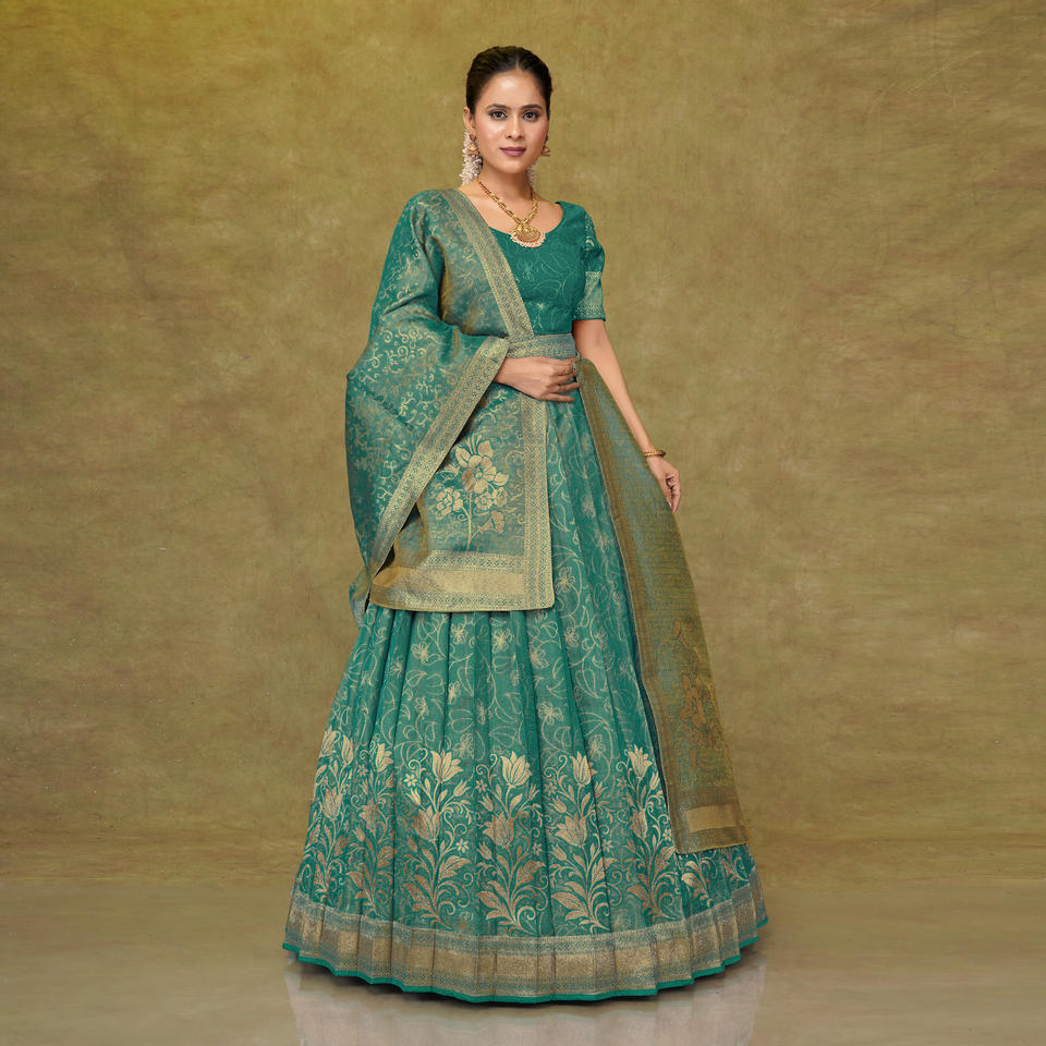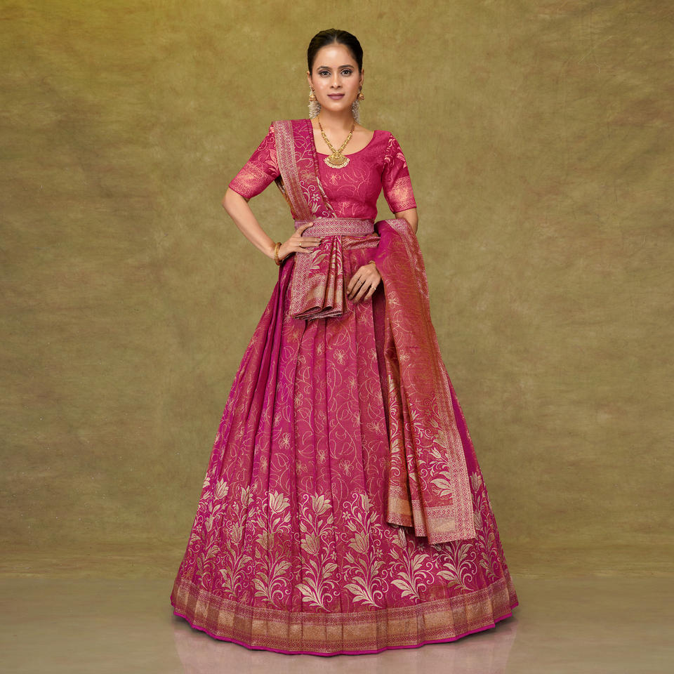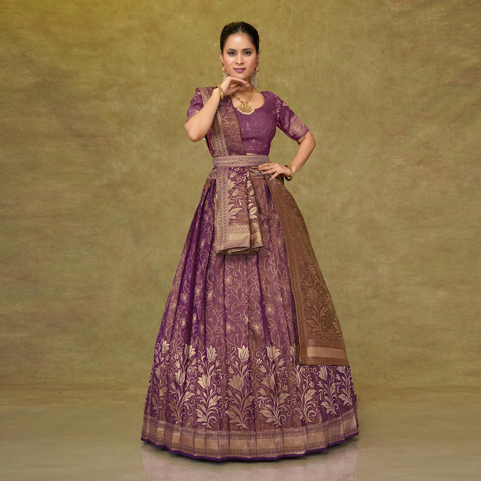 ชุดเลเฮนกาโชลีผ้าไหมบานาราสีสุดหรู พร้อมงานปักลายดอกไม้แบบซารี ดีไซน์ดั้งเดิมสำหรับงานมงคลและงานแต่งงาน คอลเลคชั่นชุดพื้นเมือง