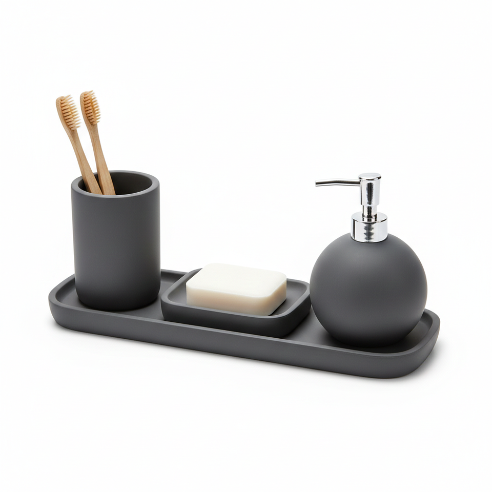 ถาดวางของในห้องน้ำพลาสติกดีไซน์หรู พร้อมแก้วใส่แปรงสีฟัน ที่วางสบู่เหลว และที่ล้างมือ ผลิตในอเมริกา เหมาะสำหรับจัดระเบียบห้องรับแขก