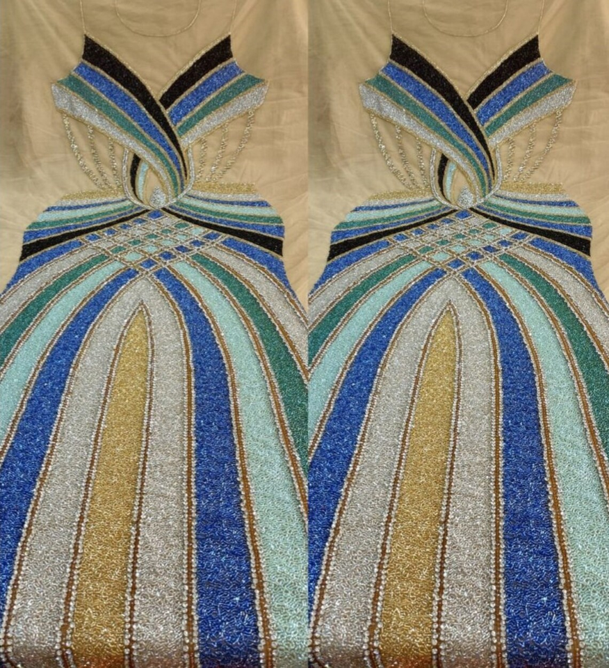 ชุดเดรสคลับยาวกรอมพื้น คอวีลึก ทรงตรง เอวธรรมชาติ ประดับด้วยลูกปัด ปักเลื่อม งานปักมือ สวยงามหรูหรา