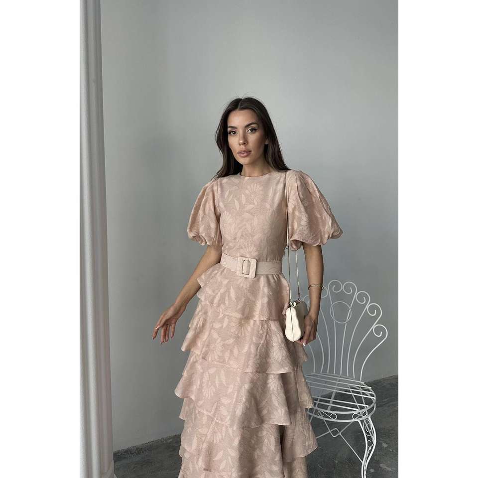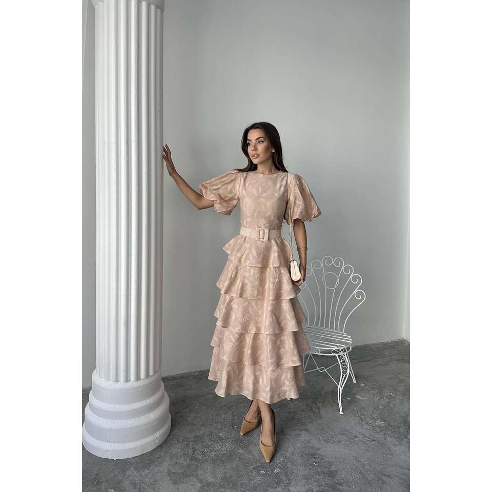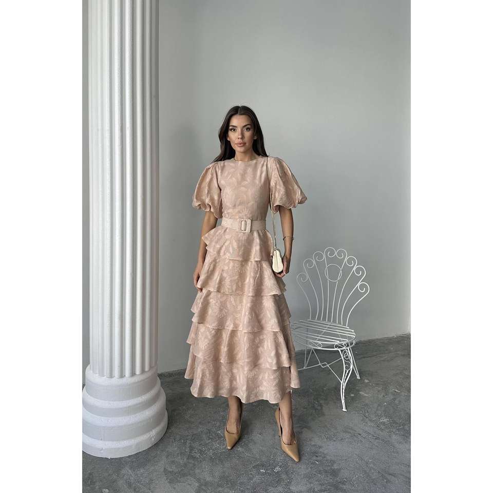เดรสทรงเอไลน์ผ้าซาตินสีเบจหรูหรา แขนทรงบอลลูนแบบเลเยอร์ แต่งเข็มขัด คอทรงโอ สไตล์วินเทจ สำหรับงานกลางคืน