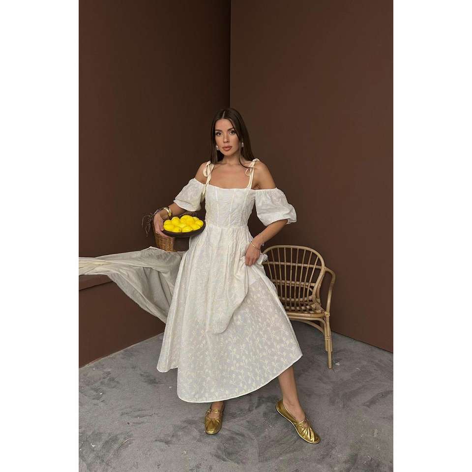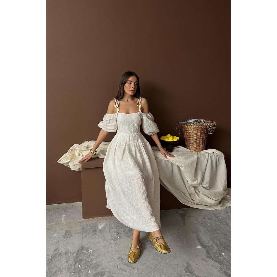 เดรสทรงเอไลน์สีเบจสุดหรู แขนบอลลูนผูกเชือก ปักลาย แต่งระบายช่วงเอวทรงเอ็มไพร์ ผ้าทอระบายอากาศได้ดี เหมาะสำหรับใส่ในชีวิตประจำวัน