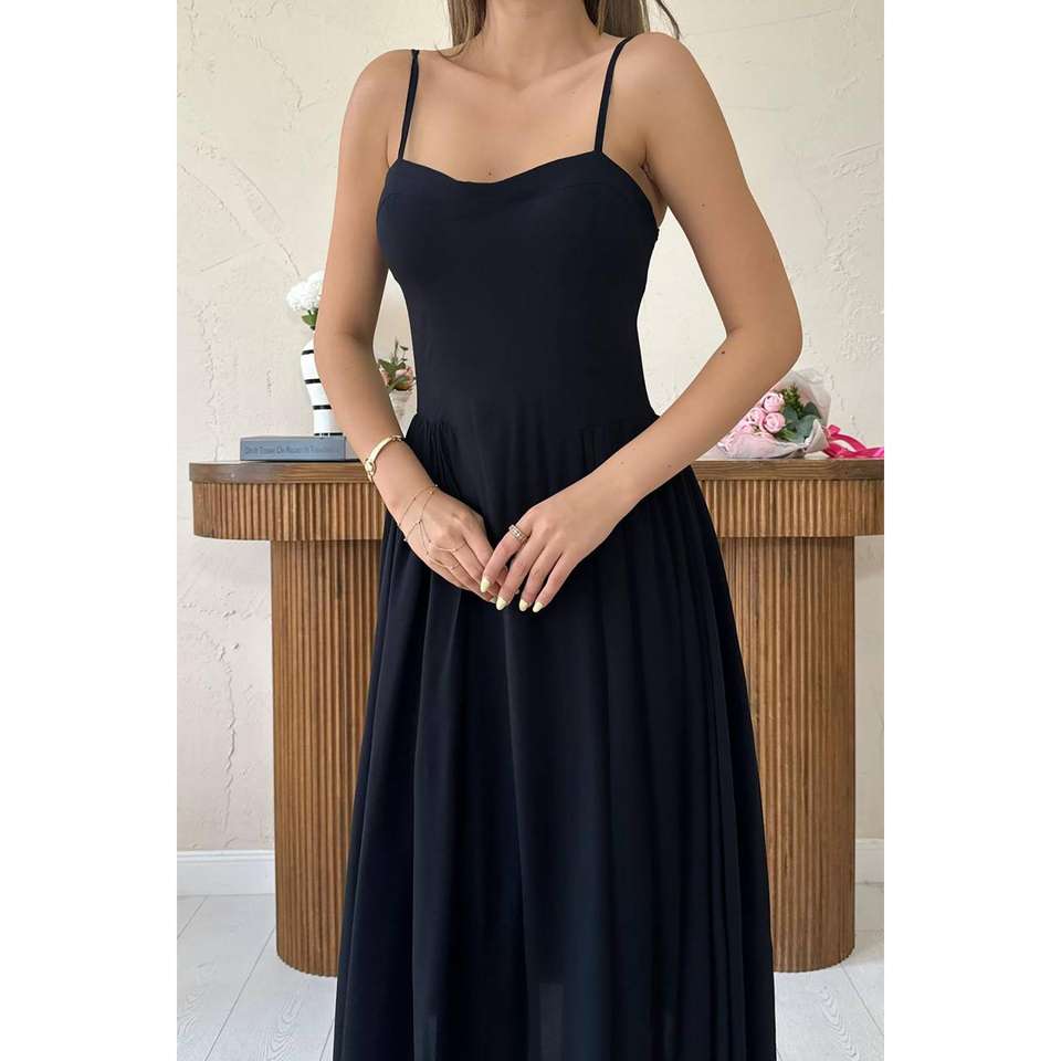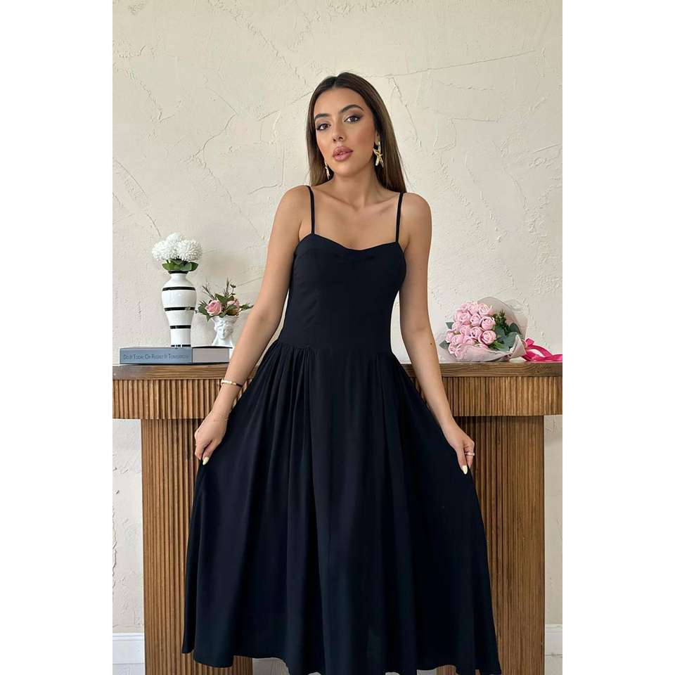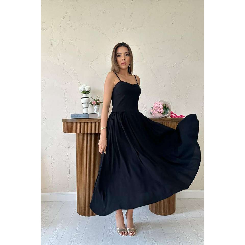 ชุดราตรีทรงเอไลน์สีดำสุดหรู คอเหลี่ยม ผ้าซาติน ความยาวปานกลาง เอวทรงธรรมชาติ ดีไซน์จับจีบ ผ้าระบายอากาศได้ดี