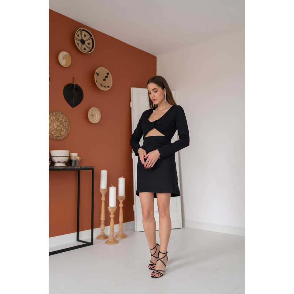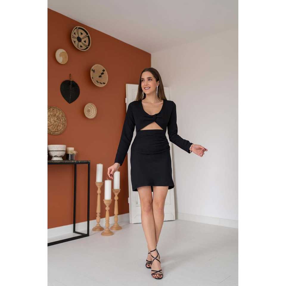 เดรสทรงเข้ารูปสีดำสุดหรู คอวีเว้าด้านหน้า สวมใส่สบายสำหรับงานกลางคืน เอวทรงธรรมชาติ แขนยาว