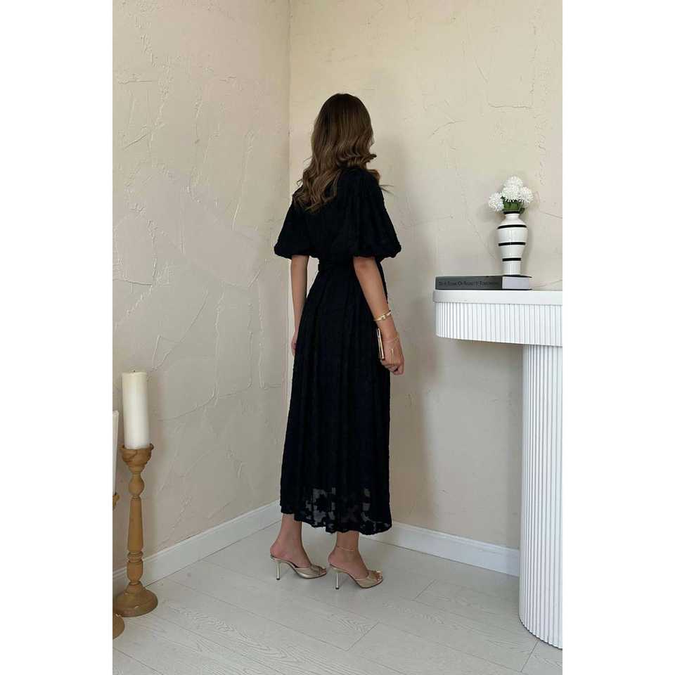 เดรสผ้าชีฟองสีดำหรูหรา แขนทรงบอลลูน ทรงเอไลน์ คอวี แต่งผ้าซีทรู เหมาะสำหรับงานพรอม