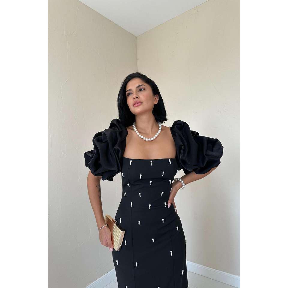 ชุดเดรสทรงเข้ารูปสีดำปักลายหรูหรา คอเหลี่ยม แขนพอง ผ้าซาติน ชุดราตรี เอวทรงธรรมชาติ สไตล์แฮนด์เมด