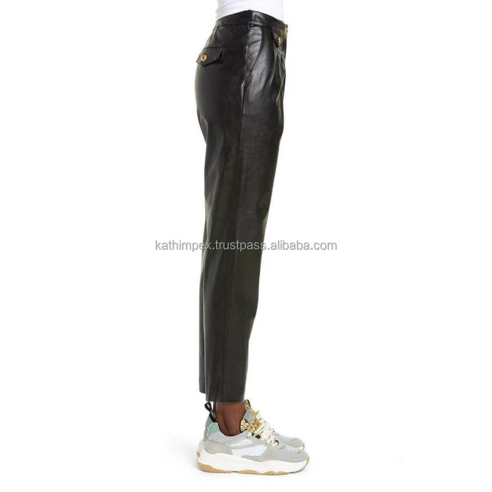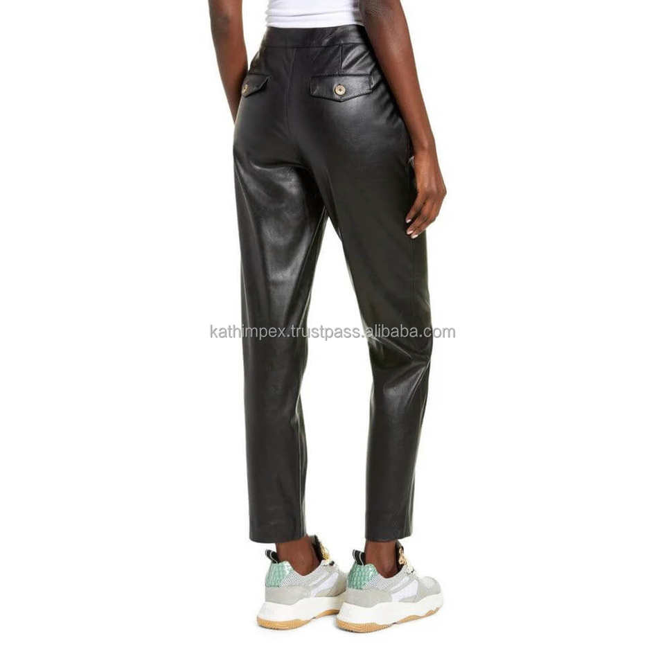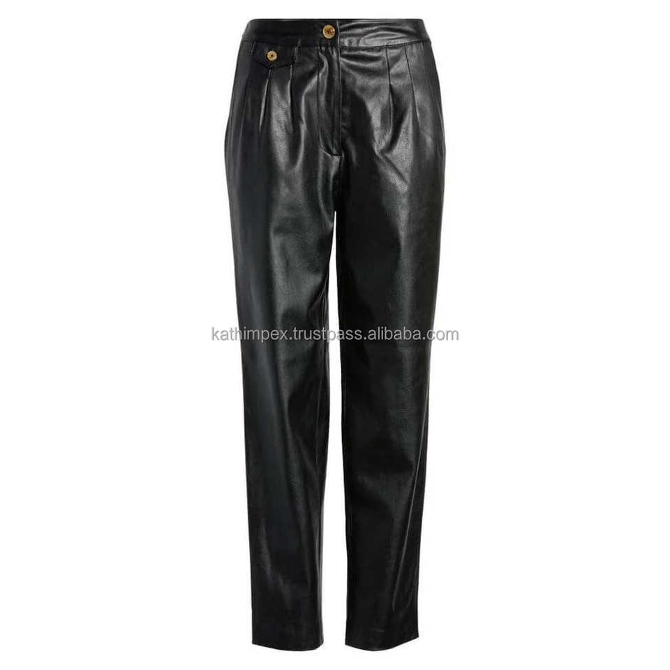 กางเกงขายาวทรงสกินนี่เอวสูงสำหรับผู้หญิง ดีไซน์หรูหรา สีดำ ทำจากหนังเทียม ระบายอากาศได้ดี เป็นมิตรกับสิ่งแวดล้อม แต่งจีบและกระดุม สไตล์ลำลอง