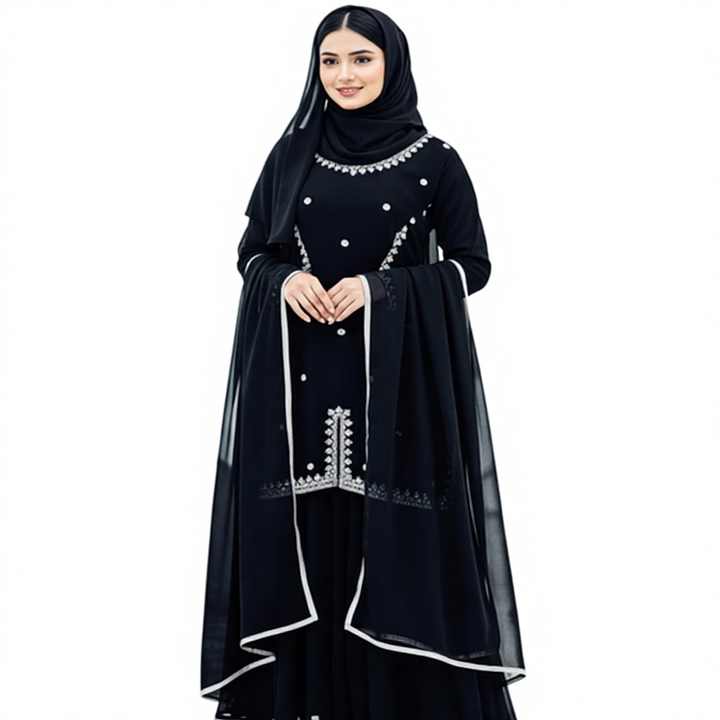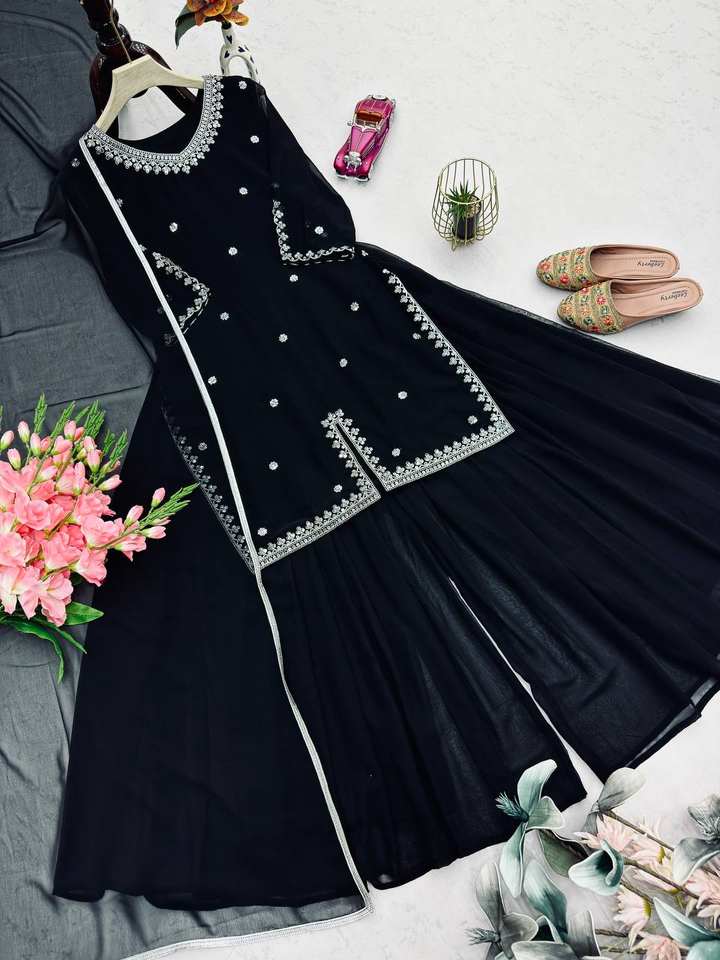 ชุดชาราร่าผ้าจอร์เจตต์สีดำสุดหรู ปักลายหนักแน่น สไตล์อันตราไลฟ์สไตล์ ไม่ยับ แห้งเร็ว เหมาะสำหรับงานปาร์ตี้สไตล์บอลลีวูด ฤดูหนาว แบบดั้งเดิม