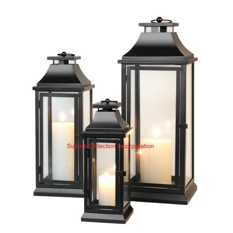 โคมไฟโลหะสีดำหรูหราพร้อมแผงกระจกใสสำหรับตกแต่งบ้านงานแต่งงานและกิจกรรมเชิงเทียนสไตล์วินเทจสำหรับในร่ม