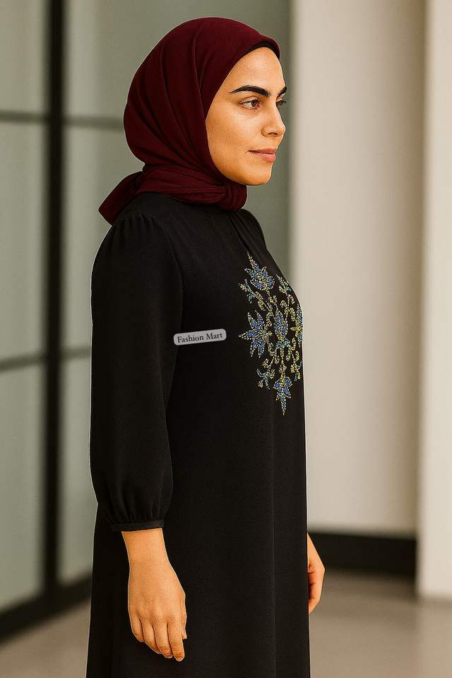 เดรสสุภาพสีดำสำหรับผู้หญิงเดรสแม็กซี่แบบอิสลามปักลายดอกไม้พร้อมชุดราตรีแขนยาว