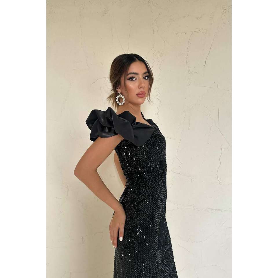 ชุดราตรีสีดำหรูหราประดับเลื่อมแบบเปิดไหล่ทรงเข้ารูป แขนพอง ดีไซน์เปิดหลัง เอวทรงธรรมชาติ