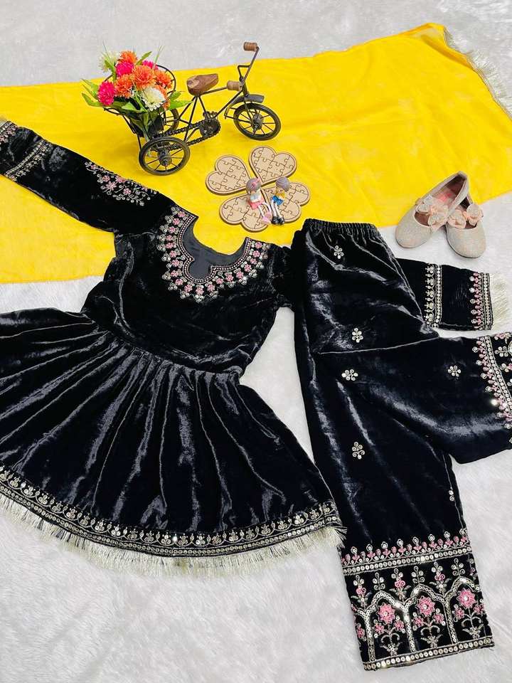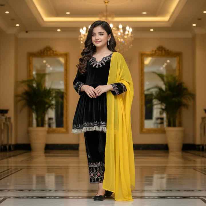 ชุดสัลวาร์ คามีซ ผ้ากำมะหยี่สีดำสุดหรู พร้อมผ้าคลุมไหล่สีเหลืองตัดกัน ชุด 3 ชิ้น สไตล์บอลลีวูด สำหรับงานปาร์ตี้ เสื้อผ้าอินเดีย