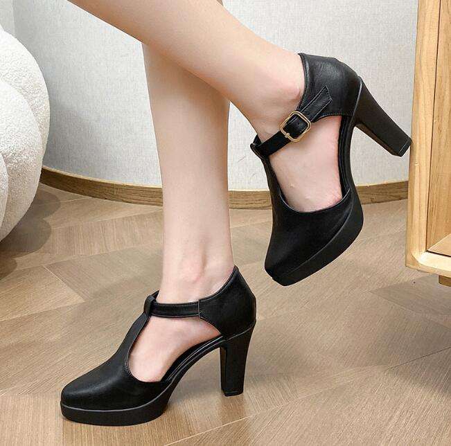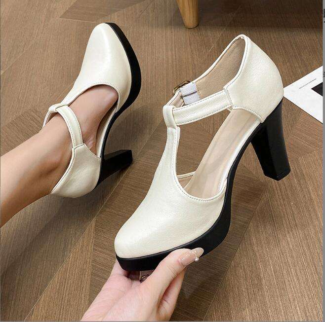 รองเท้าส้นสูงสีดำสีขาวสง่างามสำหรับผู้หญิงรองเท้าแฟชั่นส้นหนาแบบสั่งทำรองเท้า Mary Jane ส้นหนาหัวเข็มขัดรักโลหะ