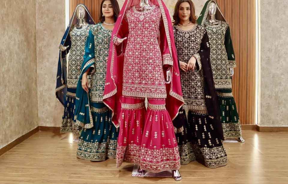 ชุดกีราร่าผ้าจอร์เจตต์ลายดอกไม้หรูหรา ปักลายด้านหน้าและด้านหลัง ประดับด้วยหินซาร์กัน ผ้าคลุมไหล่หนักพร้อมขอบ ชุดขายส่งสำหรับงานปาร์ตี้ 4 ชิ้น