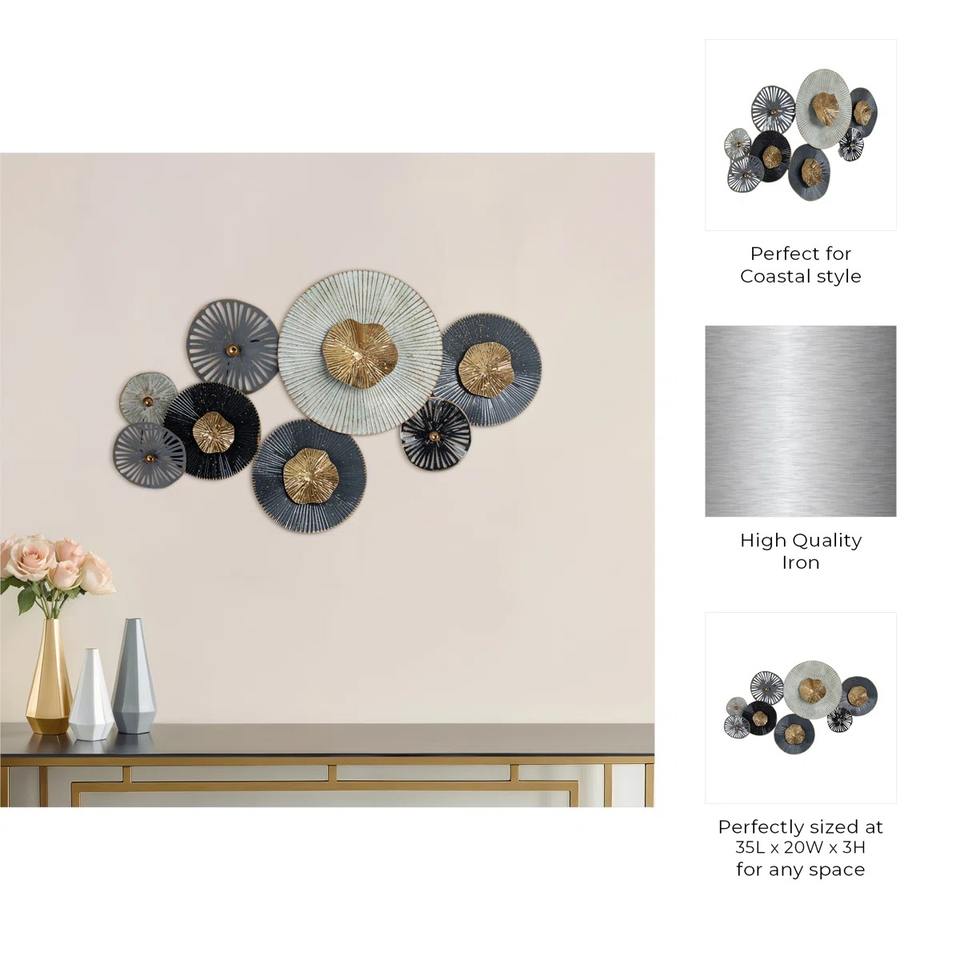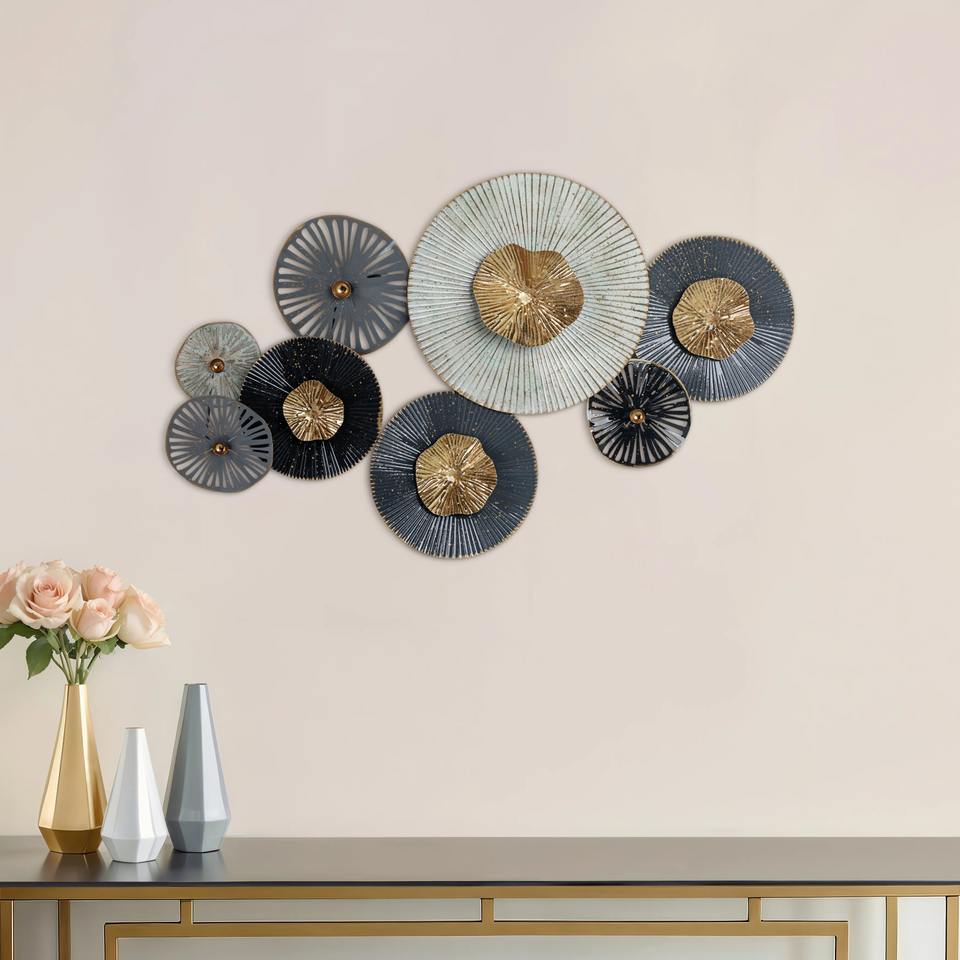 ประติมากรรมโลหะสีน้ำเงินและสีทองสุดหรู เหมาะสำหรับตกแต่งผนังหลังโซฟาและจัดแต่งพื้นที่รับประทานอาหาร ขายส่งจากอินเดีย