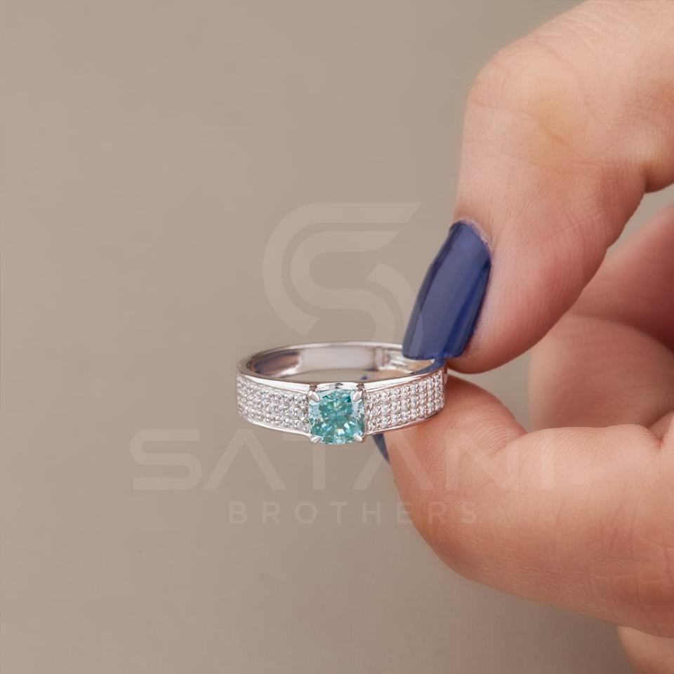 แหวนหมั้นเพชรโมอิสซาไนต์สีเขียวอมฟ้าทรงคุชชั่น ประดับเพชรแบบพาเว่ ตัวเรือนทอง 18K ชุบโรเดียม สำหรับผู้หญิง หรูหรา