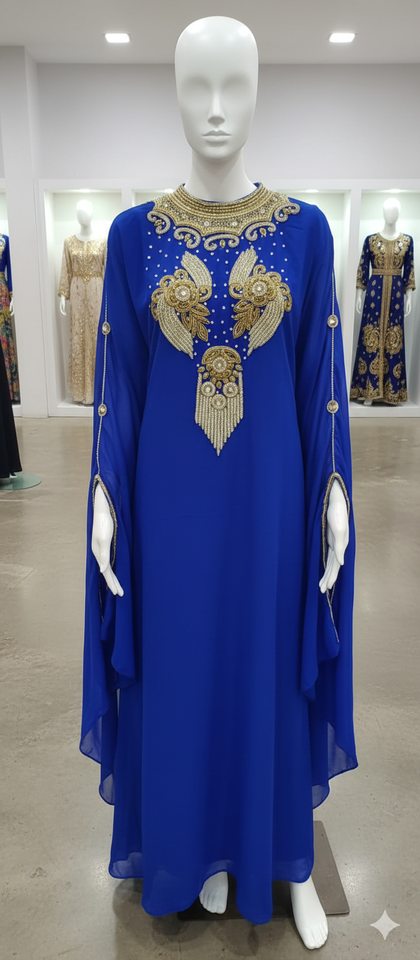 Elegant Blue Kaftan with Gold Embroidery on a White Mannequin in a Sunlit Outdoor Garden with Stone Path and Flowers.