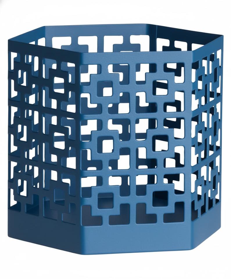 เชิงเทียนโลหะสีน้ำเงินทรงหกเหลี่ยม ดีไซน์หรูหรา พร้อมลวดลายฉลุเรขาคณิต เหมาะสำหรับตกแต่งโต๊ะกลางบ้านและงานอีเว้นท์