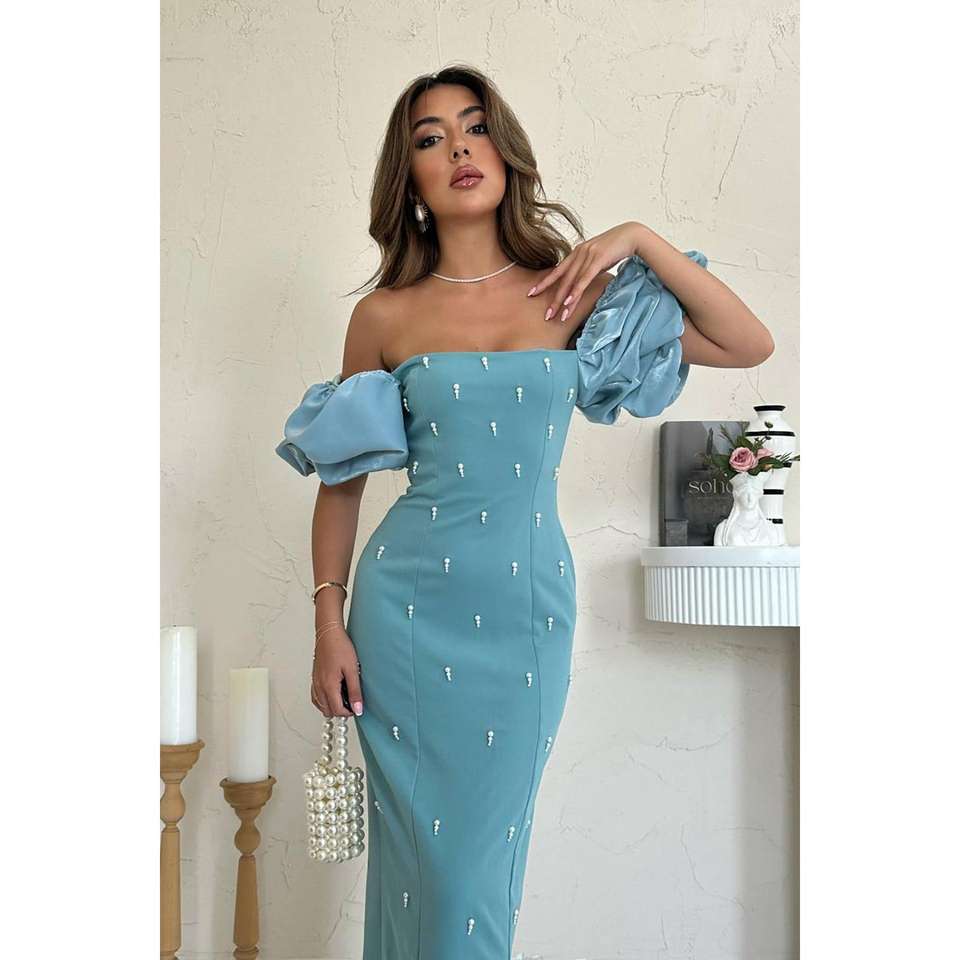 ชุดราตรีผ้าซาตินสีน้ำเงินหรูหราประดับด้วยไข่มุก คอเหลี่ยม แขนพอง เอวธรรมชาติ