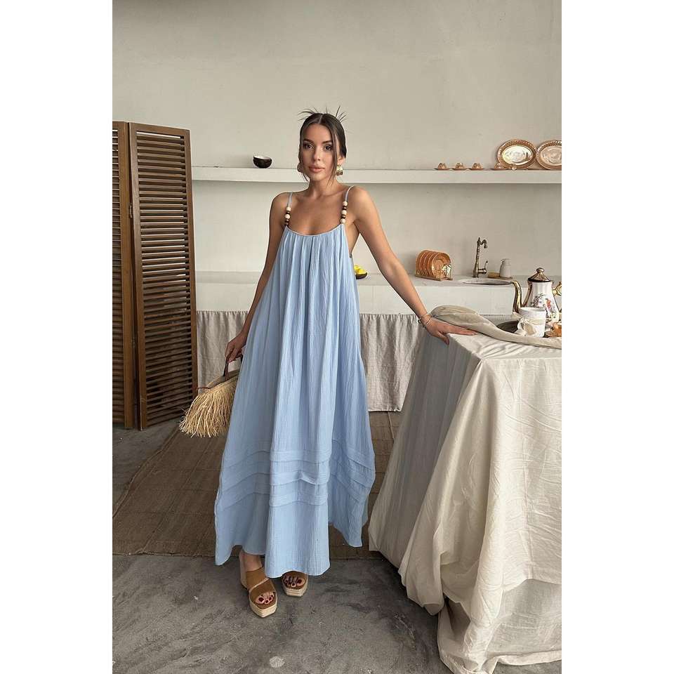 เดรสผ้ามัสลินสีน้ำเงินแบบมีสายรัด ดีไซน์หลวมๆ เปิดหลัง สายสปาเก็ตตี้ ระบายอากาศได้ดี ทออย่างประณีต สวมใส่สบายๆ เหมาะสำหรับวันพักผ่อน