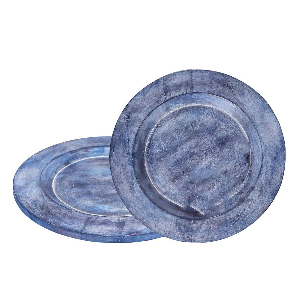 จานชาร์จไม้สีฟ้าหรูหราสำหรับการตั้งค่าโต๊ะจานกลมทำด้วยมือสำหรับการรับประทานอาหารงานเลี้ยงงานแต่งงานโอกาส
