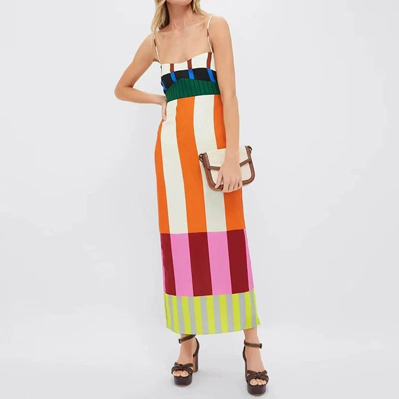 ชุดเดรสโบฮีเมียนสีตัดกันสายคล้องคอคอวีพิมพ์ลายสไตล์ผู้หญิงลำลองสไตล์เอวธรรมชาติทรงตรงเงา