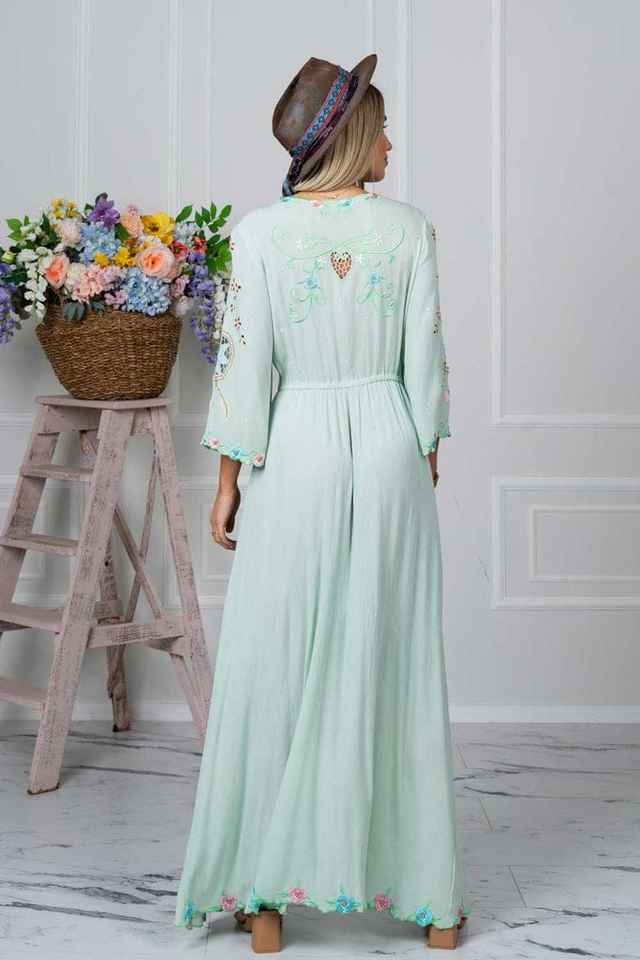 ชุดแมกซี่เดรสปักลายดอกไม้สไตล์โบฮีเมียน100% คอตตอนแฟชั่นฤดูร้อนคอวีหรูหราตกแต่งด้วยกระดุม