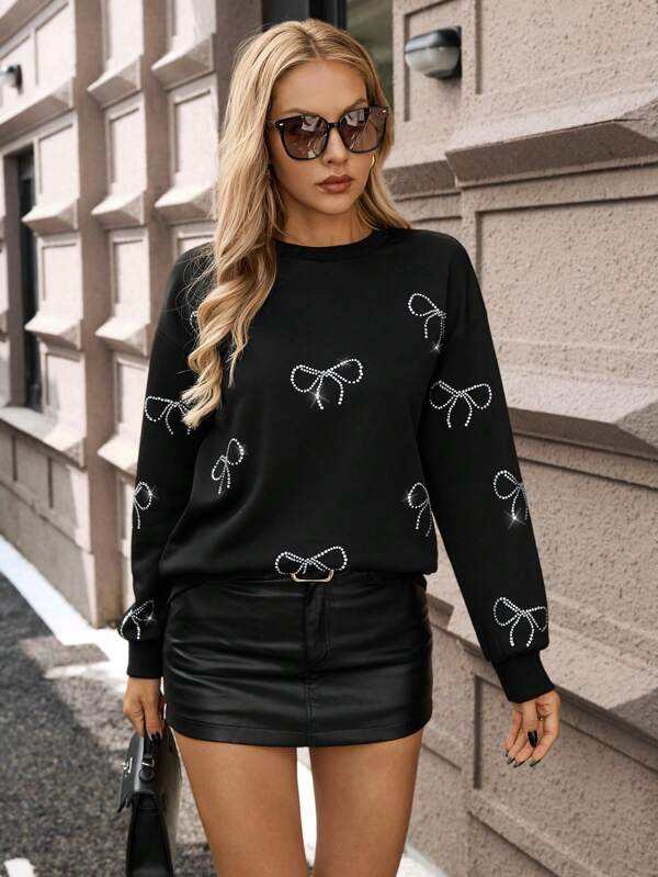 เสื้อสเวตเตอร์ประดับโบว์หรูหราพร้อมเสื้อสวมหัวโอเวอร์ไซส์สำหรับผู้หญิงเสื้อสเวตเตอร์คอตตอนสวมใส่สบาย