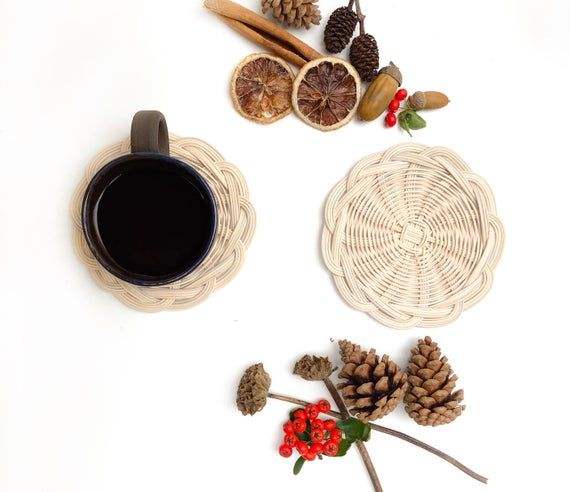 ที่รองแก้วหวายถักอย่างหรูหราเหมาะสำหรับจับคู่กับผ้าปูโต๊ะผ้าลินินและอุปกรณ์เสิร์ฟไม้เพื่อสร้างบรรยากาศสบายๆ