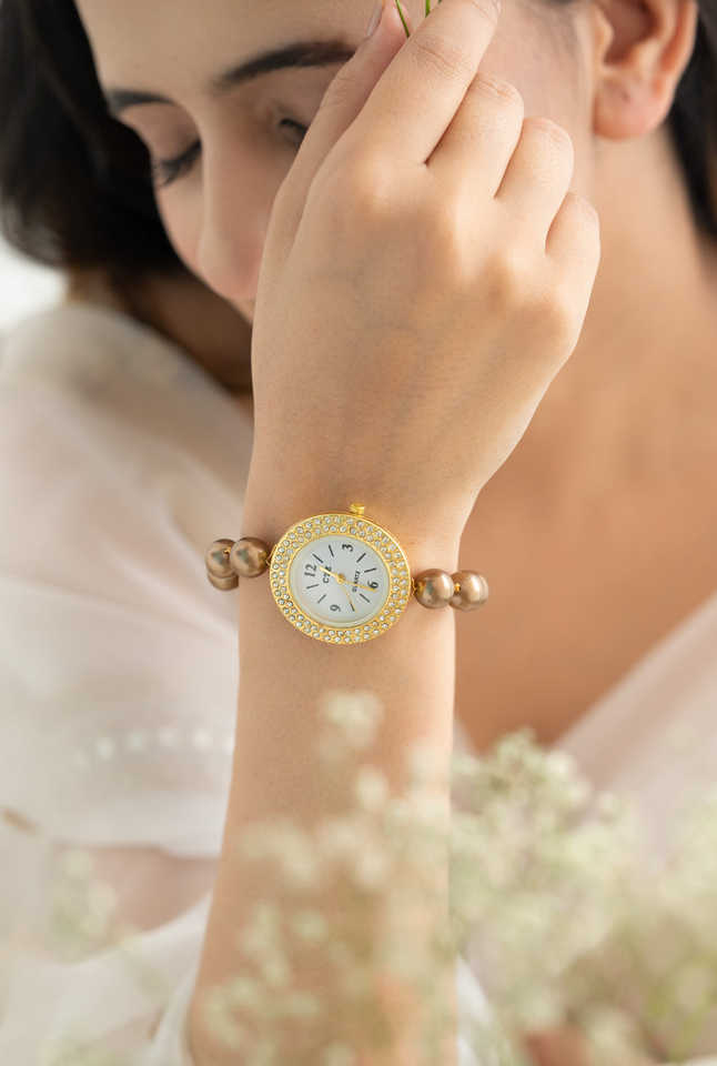 นาฬิกาข้อมือสตรีประดับลูกปัดมุกสีน้ำตาลสุดหรูพร้อมนาฬิกาข้อมือชุบทองนาฬิกาแฟชั่นสุดหรู